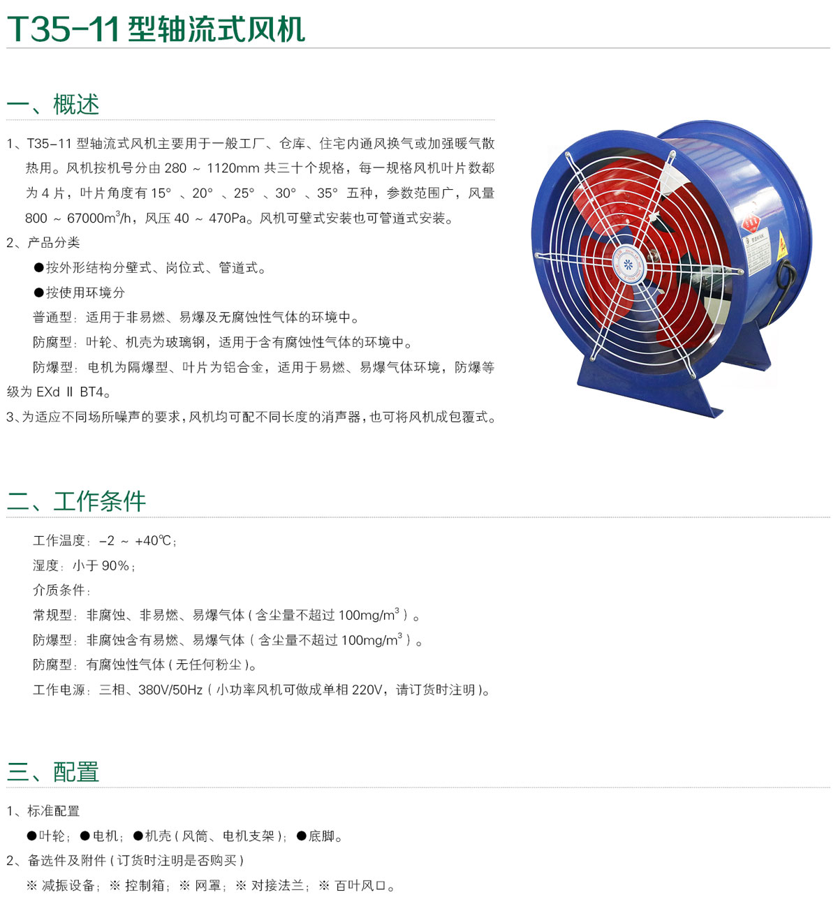 T35-11係列軸流風機是在T30-11的基礎上改進設計的新型風機,主要優點是(shì)結構更合理,性能有了較大提高,分為防腐軸(zhóu)流風(fēng)機(FT35-11型)、防爆軸流風機BT35-11型和防腐(fǔ)防爆軸(zhóu)流風機BFT35-11型。