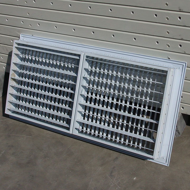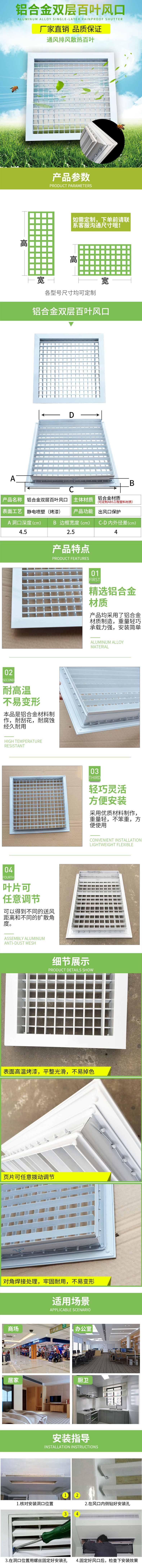 雙層百葉風口,廣泛應用於空調係統中作送風口,根據使用要求,風口後麵可配製(zhì)鋁製風量調節閥(人字閘),雙層百(bǎi)葉風口具有兩層相互垂直頁片調節水平和垂直頁片的(de)角度,